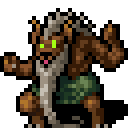 A withered old gnoll with a long silver beard, wielding a quarterstaff and wearing a cloak. He looks like a figure from mythology! Wait, is his beard held on to his ears with hooks?
